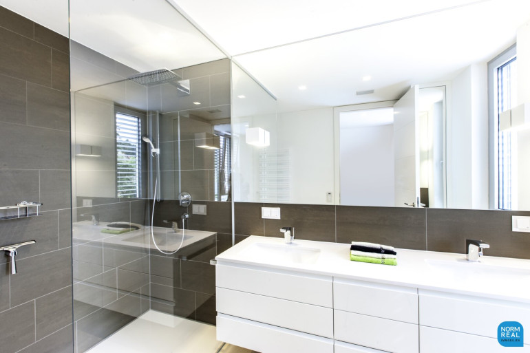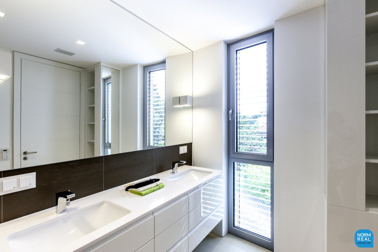 Ein großer Schrankraum mit hochwertigen Tischlereinbauschränken mit Innenbeleuchtung und Ladenkommoden, ein separates Gäste-WC mit einem Handwaschbecken ausgestattet befinden sich ebenfalls auf dieser Ebene sowie das Schlafzimmer mit ensuite Duschbad mit Doppelwaschtisch und Stauraum für Medikamente und Kosmetika.