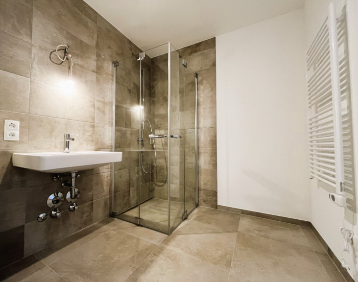 - Badezimmer mit Walk-In-Dusche, WC, Waschbecken, Waschmaschinenanschluss