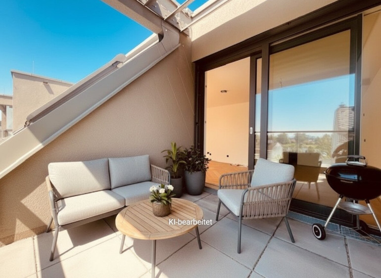 Die 87m² verteilen sich auf eine großzügige und sonnige Wohnküche mit rd. 35m² und Südterrasse, zwei lichtdurchflutete Schlafzimmer, ein großes Badezimmer mit Fenster und Nebenräume. Diese wunderschöne Dachwohnug bietet Ihnen außerdem noch ausreichend Platz für individuelle Gestaltung. Ein wunderbarer ruhiger, urbaner Rückzugsort von der Großstadthektik – hier finden Sie die perfekte Balance zwischen modernem Wohnkomfort und einem einladenden Ambiente.