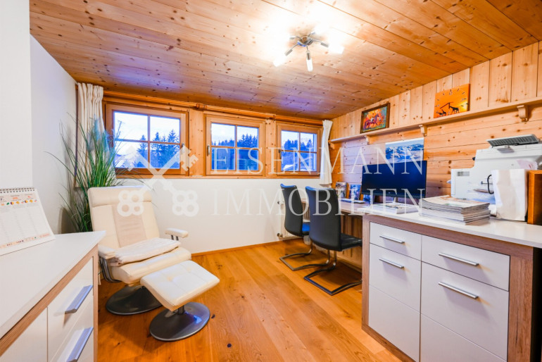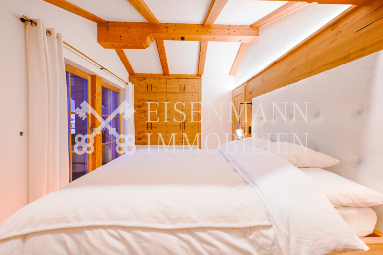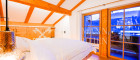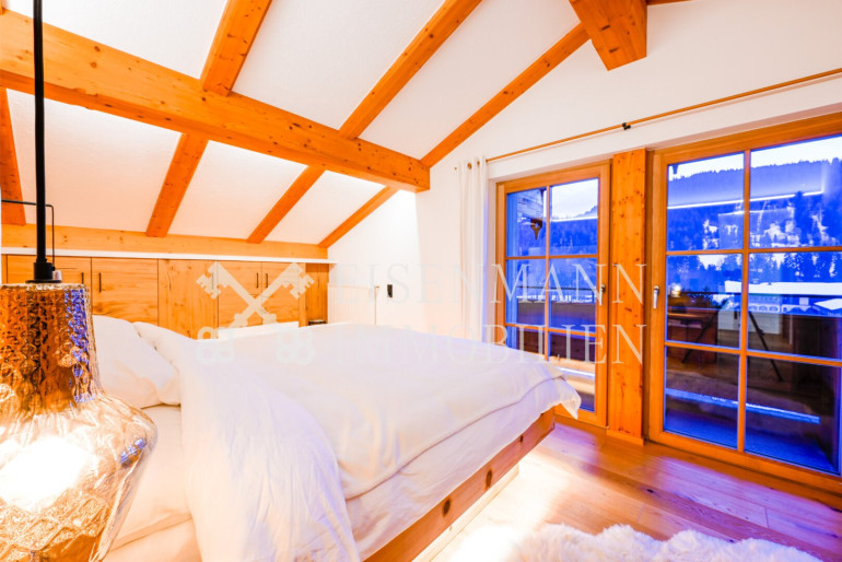 - Schlafzimmer mit Flair: Das großzügige Hauptschlafzimmer beeindruckt durch einen imposanten Sichtdachstuhl aus Naturholz sowie ein durchdachtes Lichtkonzept, das für eine besonders behagliche und edle Atmosphäre sorgt. Genießen Sie von hier aus den direkten Zugang zum Balkon und den unverbauten Blick auf das Kitzbüheler Horn sowie und den Astberg.