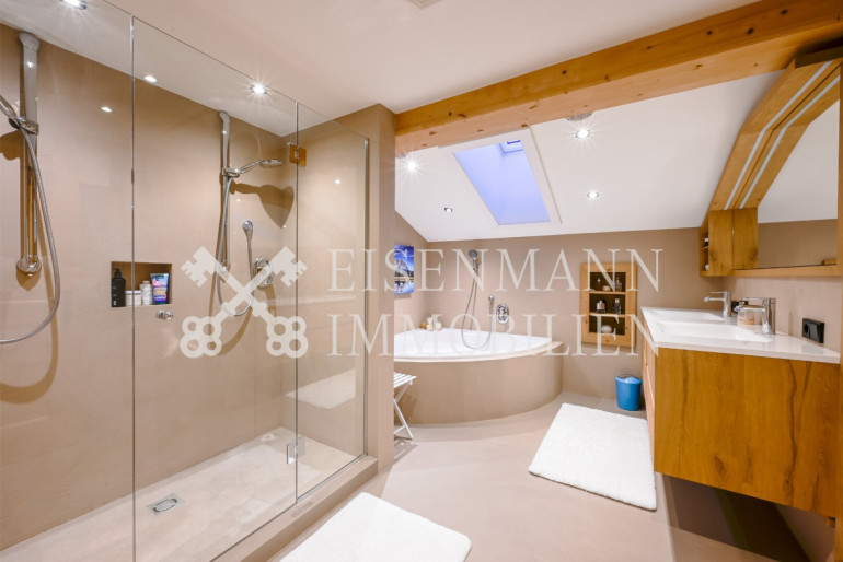 - Exklusives Master-Bad: Das Badezimmer besticht durch seine hochwertige Ausstattung und klare Linien. Es verfügt sowohl über eine großzügige Dusche als auch über eine elegante Badewanne. Für maximale Privatsphäre und Komfort im Alltag sorgen zudem zwei separate WCs, die räumlich vom Hauptbad getrennt sind.
