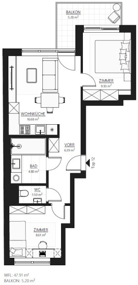 Die Wohnung T12 verfügt über 47,91m² Wohnfläche, und teilt sich wie folgt auf: