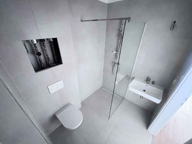 • Großformatige Fliesen in den Sanitärbereichen.