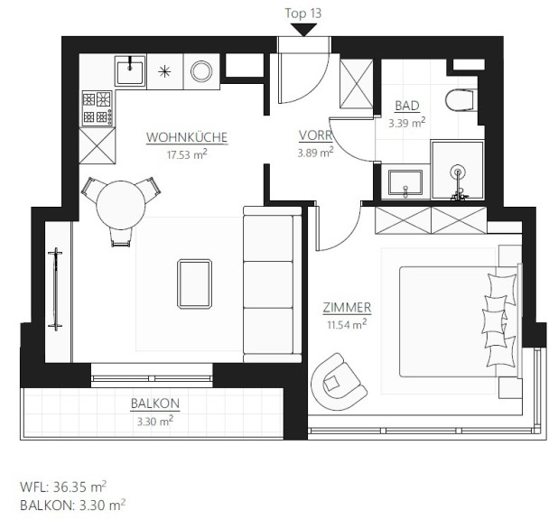 Die Wohnung T13 verfügt über 36,35m² Wohnfläche, und teilt sich wie folgt auf: