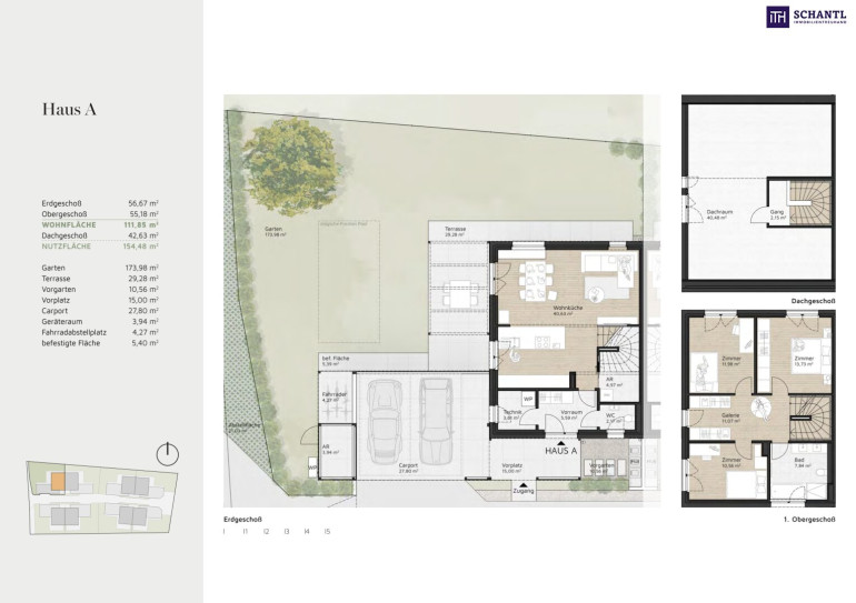 - 4 Doppelhäuser mit je 2 Wohneinheiten: Wohnfläche 111,85 m² zzgl. ausbaubares DG mit jeweils 42,63 m²