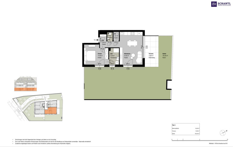 Wohnfläche: ca. 53,30m² + Terrasse: ca. 13,86m² + Eigengarten: ca. 103.30m² + Kellerabteil