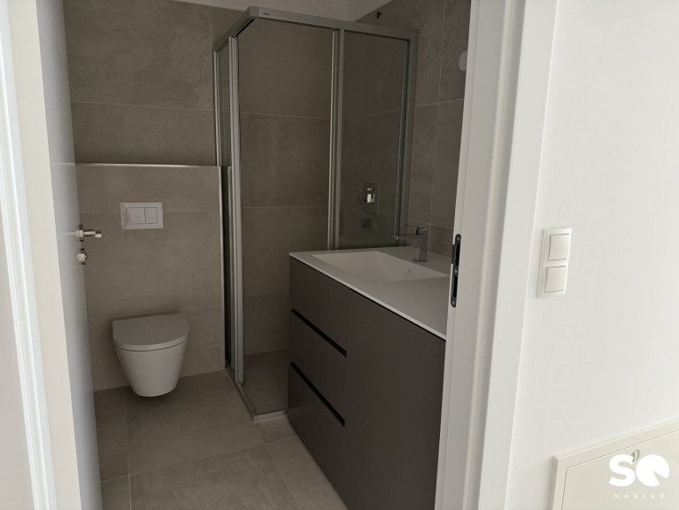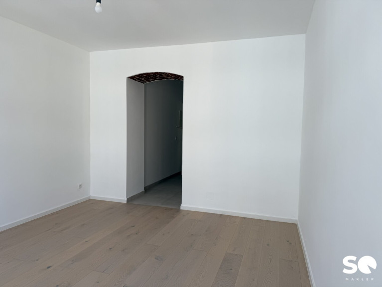 Das Badezimmer ist mit einer modernen Dusche, WC und geschmackvollen Details ausgestattet. Dank neuer Fenster genießen Sie angenehme Lichtverhältnisse und ausgezeichnete Wärmedämmung, während Sie den Altbaucharakter in vollen Zügen erleben können.
