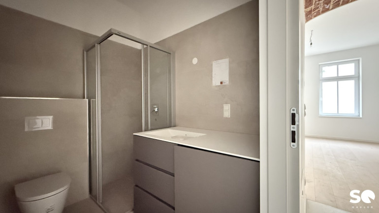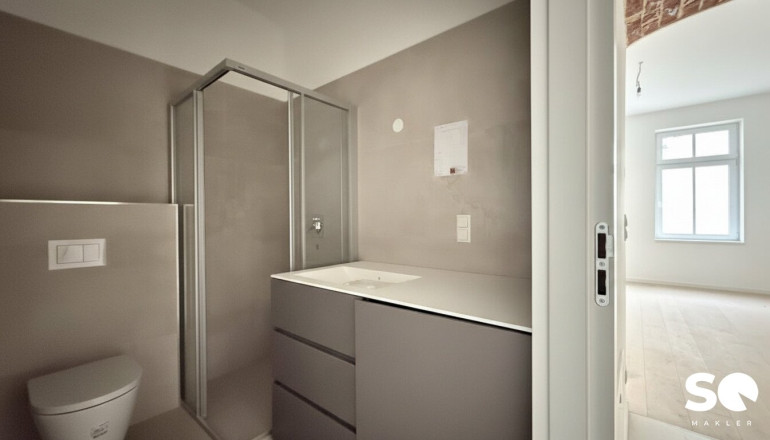 Das Badezimmer ist mit einer modernen Dusche, WC und geschmackvollen Details ausgestattet. Dank neuer Fenster genießen Sie angenehme Lichtverhältnisse und ausgezeichnete Wärmedämmung, während Sie den Altbaucharakter in vollen Zügen erleben können.