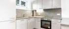 Im Wohnraum befindet sich eine eingebaute Küche mit folgenden Geräten: Herd und Dunstabzug, Kühlschrank (inkl. Tiefkühlfach), Backrohr, Geschirrspüler.