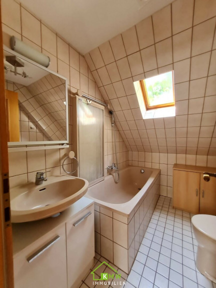 Zudem gibt es auf dieser Ebene noch ein zweites Badezimmer mit Badewanne, WC und Fenster.