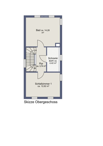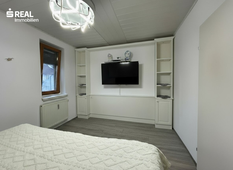 Im Obergeschoss befinden sich ein geräumiges Schlafzimmer, ein separater Schrankraum sowie das frisch renovierte Badezimmer mit rund 14 m², das durch moderne Ausstattung und viel Platz besticht.