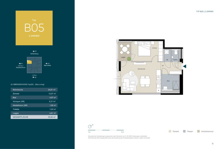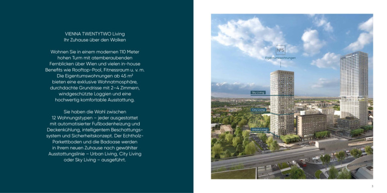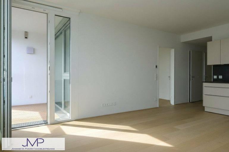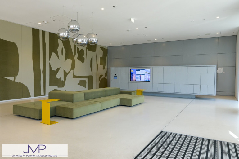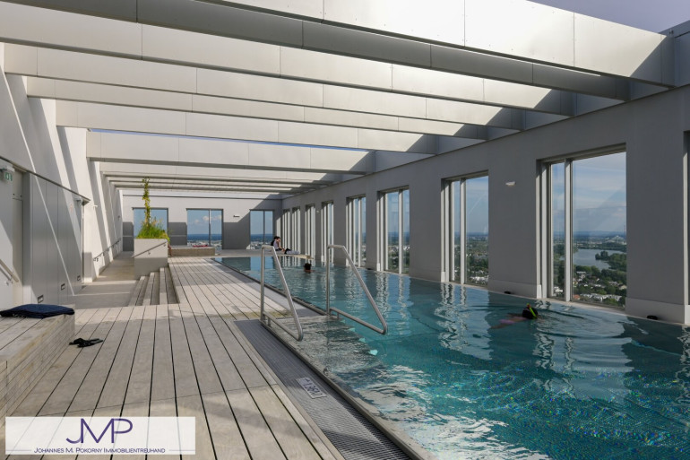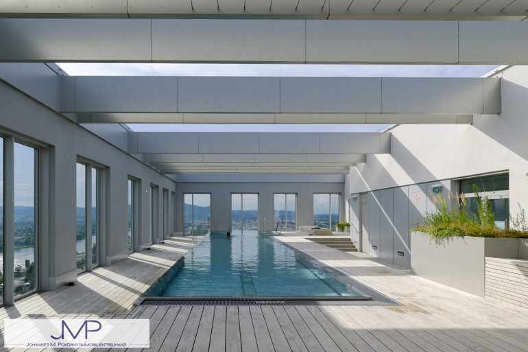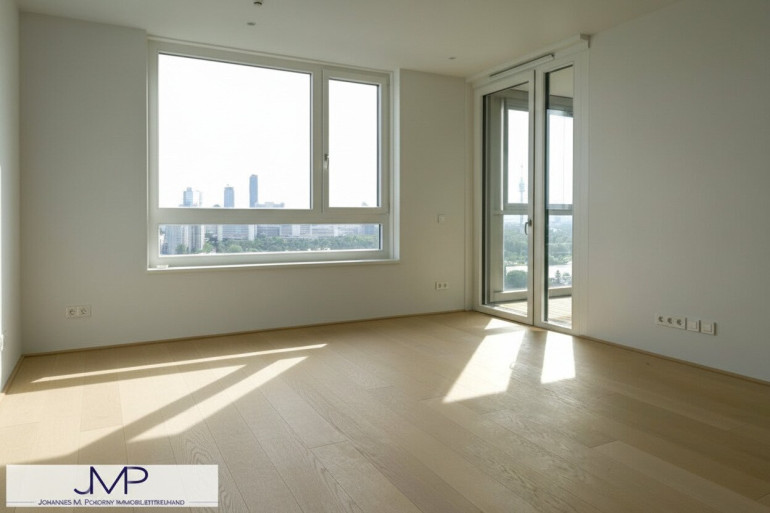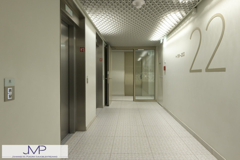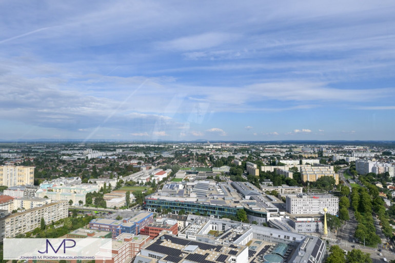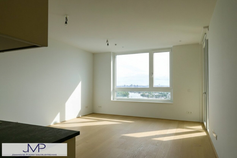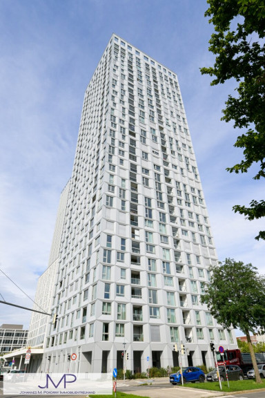 Die sehr hochwertig ausgestattete Wohnung, hat in den Wohnräumen eine Raumhöhe von 2,67m und ist 50,25m² groß. Sie liegt im 22. Stock des kürzlich fertig gestellten Wohnturms, besteht aus 2 Zimmern und hat eine sensationelle Fernsicht über ganz Wien.