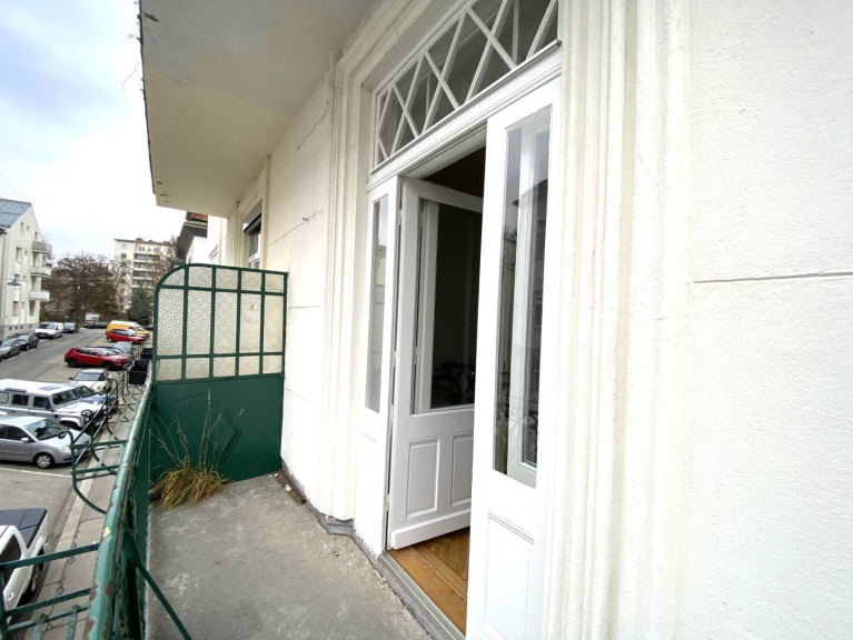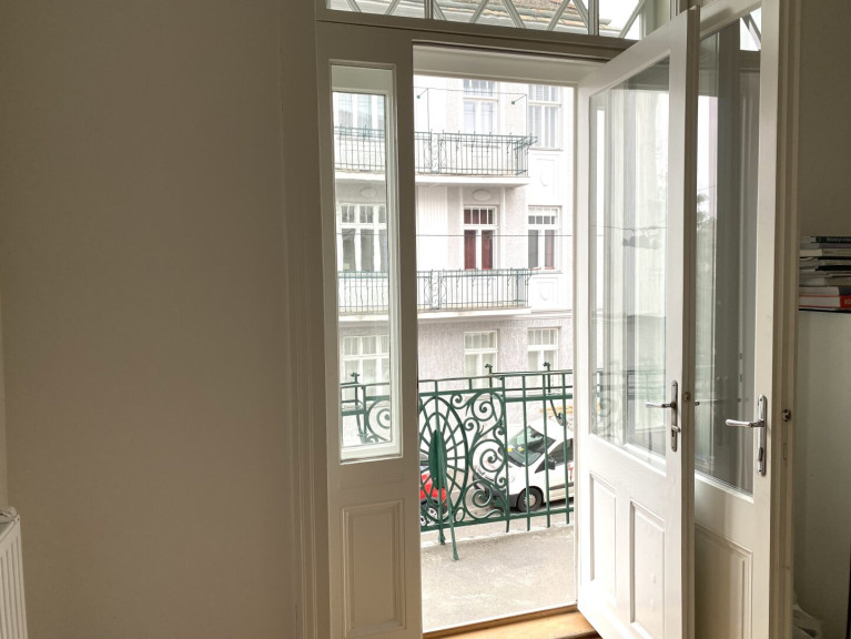 helles Wohnzimmer mit Zugang auf den Balkon (Blick in die Sauerburggasse)
