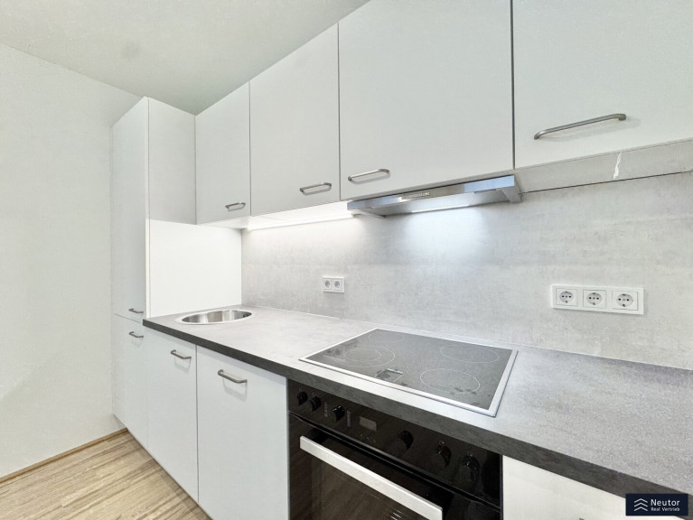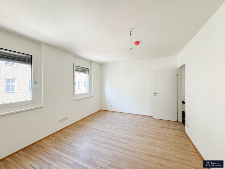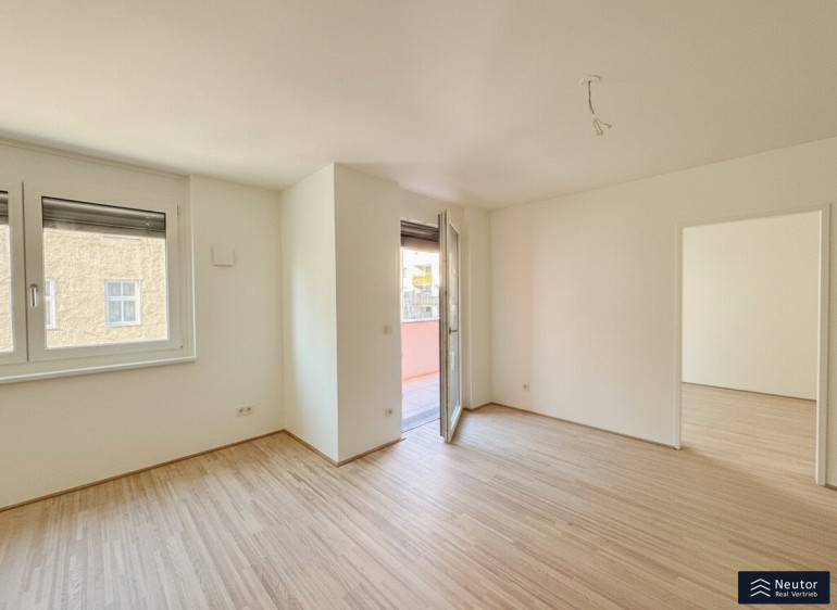 Beim Betreten werden Sie von einem einladenden Vorraum empfangen, der Platz für eine Garderobe und persönliche Akzente bietet. Rechts befindet sich ein praktischer Abstellraum, der zusätzlichen Stauraum für Vorräte, Haushaltsgeräte oder Alltagsutensilien schafft. Geradeaus öffnet sich der großzügige, lichtdurchflutete Wohnbereich, in dem Küche, Essplatz und Wohnzimmerharmonisch ineinander übergehen. Die offene Gestaltung schafft ein angenehmes Raumgefühl und lädt zum Kochen, Entspannen und Verweilen ein. Von hier aus gelangen Sie direkt auf die überdachte Loggia – ein geschützter Außenbereich, der sich ideal für ruhige Momente im Freien eignet. Angrenzend an den Wohnbereich befindet sich eines der beiden Schlafzimmer, das ebenfalls einen direkten Zugang zur Loggia bietet – perfekt als Rückzugsort mit viel Tageslicht. Über einen kurzen Gang im Wohnzimmer erreichen Sie außerdem ein separates WC mit Handwaschbecken sowie das modern ausgestattete Badezimmer mit einer komfortablen Dusche, einem eleganten Tischlerverbau und integriertem Waschmaschinenanschluss. Ein weiteres, ruhig gelegenes Schlafzimmer ergänzt das Raumangebot und eignet sich ideal als Kinderzimmer, Gästezimmer oder Homeoffice. Mit ihrer cleveren Raumaufteilung, hochwertigen Ausstattung und der freundlich-hellen Atmosphäre bietet diese Wohnung ein Zuhause, das Stil, Komfort und Funktionalität auf gelungene Weise vereint – ideal für Paare, kleine Familien oder alle, die modernes Wohnen zu schätzen wissen.