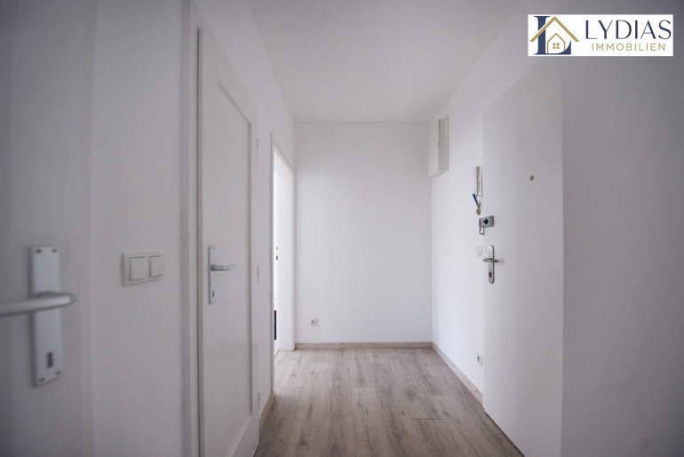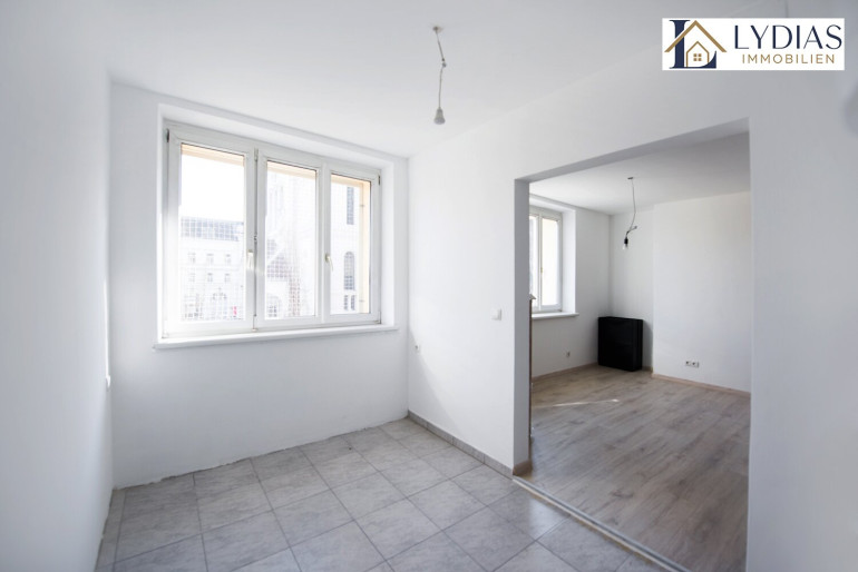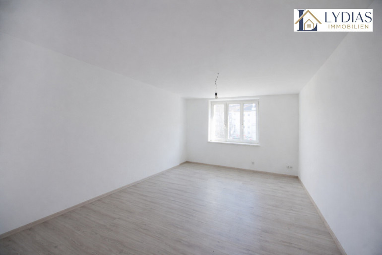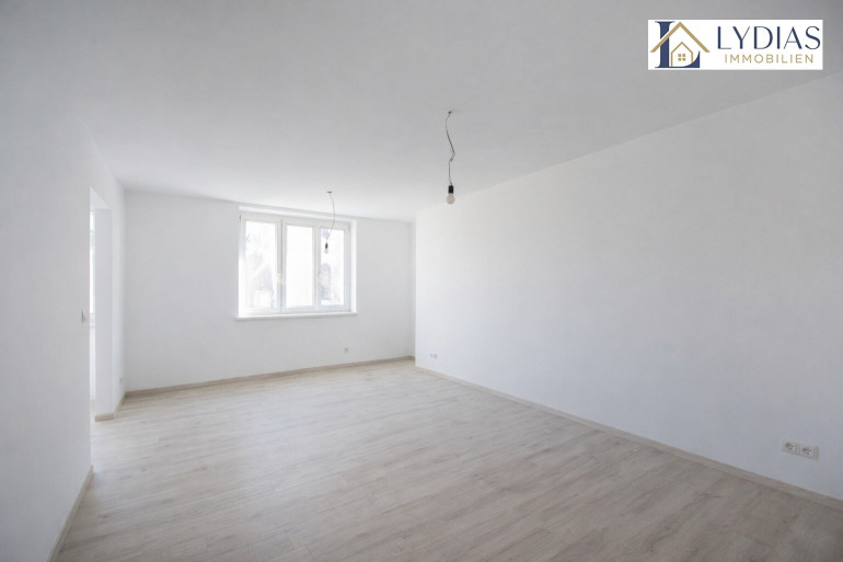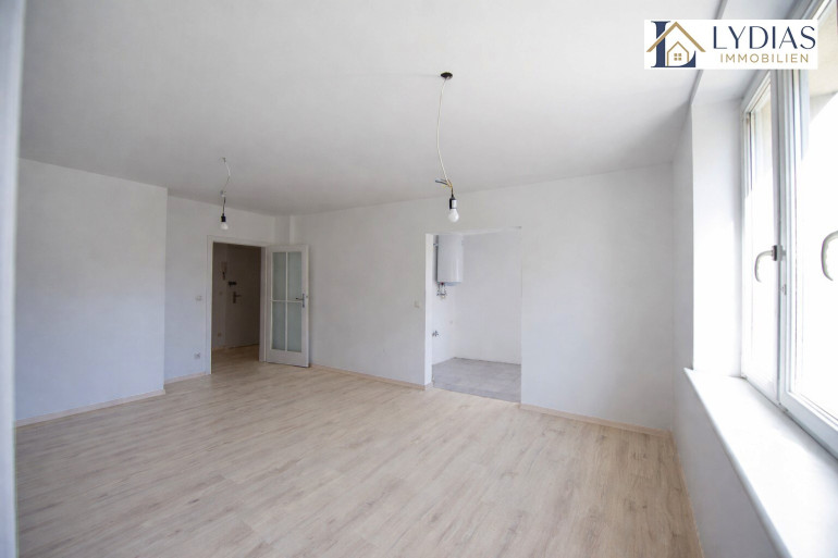 Auch die Wohnung selbst wurde kürzlich umfassend saniert und befindet sich in einem gepflegten Zustand. Die Zimmer sind zentral begehbar und südlich ausgerichtet, wodurch ein besonders helles und freundliches Wohngefühl entsteht. Vom Wohnzimmer aus gelangt man direkt in die Küche – eine praktische und zugleich wohnliche Verbindung der Räume.