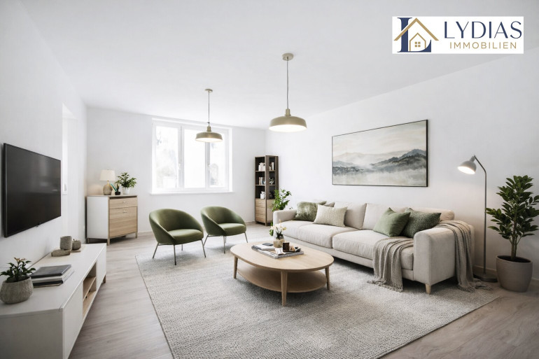 Zur Information: Die Abbildung des Wohnzimmers und des Schlafzimmers wurde virtuell gestaltet und dient der Veranschaulichung. Die Originalfotos befinden sich ebenfalls im Inserat.