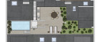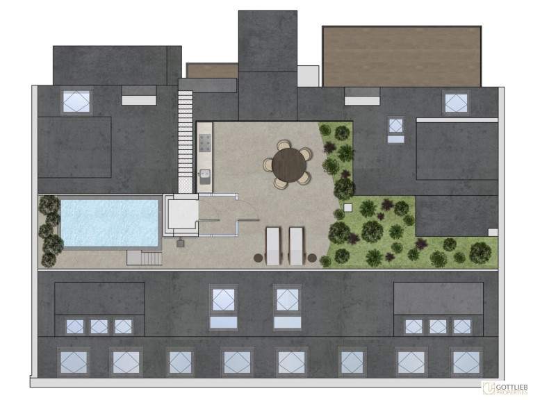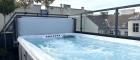 Über eine Treppe oder den Heimlift erreicht man die weitläufige, ebenfalls bereits begrünte Dachterrasse, ausgestattet mit einem Sonnensegel und einem exklusiven Outdoor-Pool mit Gegenstrom-Anlage.