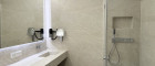 + Bad mit maßgefertigter Dusche, Badewanne, Doppelwaschbecken mit Unterschrank und beleuchtetem Spiegel