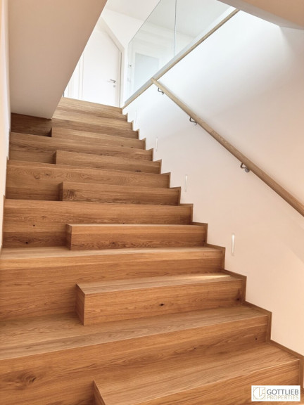 Im Obergeschoss betritt man den großzügigen, lichtdurchfluteten Wohn-Ess-Bereich mit angeschlossenen Wohnbereich sowie die beiden hofseitig gelegenen, begrünten Terrassen. Ergänzt wird das Raumangebot durch zwei Abstellräume und eine separate Toilette mit Handwaschbecken.