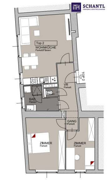 Im Zuge der umfangreichen Sanierung wurde viel Wert auf einen praktischen und gut durchdachten Grundriss gelegt. Gleich im Eingangsbereich befinden sich das WC sowie das geschmackvolle Badezimmer. Die beiden Schlafzimmer sind getrennt vom Vorraum aus zu begehen. Auch die Wohnküche überzeugt durch ihre Großzügigkeit sowie Helligkeit.
