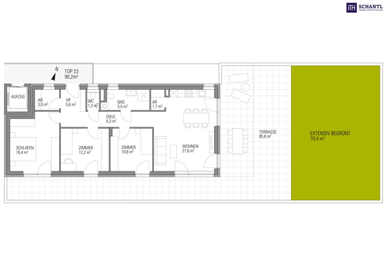 Zu den Highlights des PENTHOUSE zählt ganz klar die 85 m² große Dachterrasse mit RUNDUMBLICK, welcher ausreichend Platz für gemütliche Grillabende mit der Familie oder mit Freunden bietet.