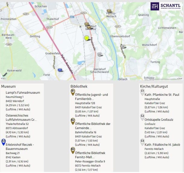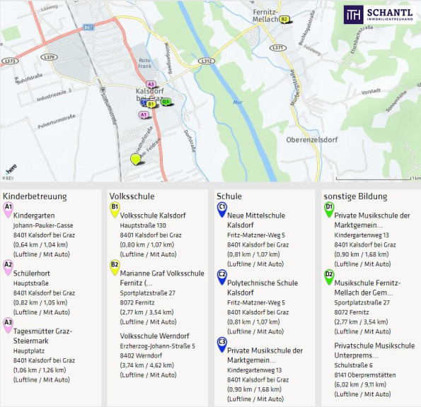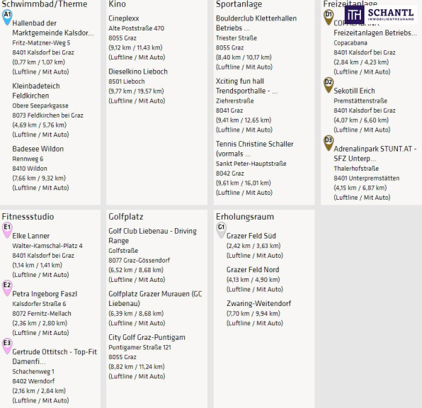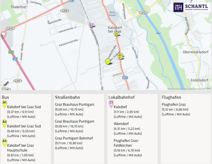 Das Objekt liegt in einer gepflegten Wohnhausanlage in der Gemeinde Kalsdorf bei Graz. Das Ortszentrum mit sämtlichen Nahversorgern, das Hallenbad Kalsdorf und der Bahnhof befinden sich in unmittelbarer Gehdistanz. Die nächste Bushaltestelle ist quasi vor der Haustüre. Die Nähe zum Schwarzl Freizeitzentrum, der Copacabana Kalsdorf, dem Flughafen Graz-Thalerhof und der Autobahn A9 bieten eine Top-Infrastruktur.