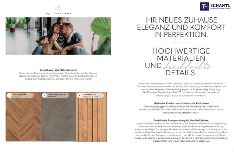 Erleben Sie außergewöhnlichen Wohnkomfort in den hochwertigen VILLA AQUA und VILLA TERRA, die mit ihrer massiven Bauweise, durchdachten Grundrissen und luxuriösen Ausstattung überzeugen.