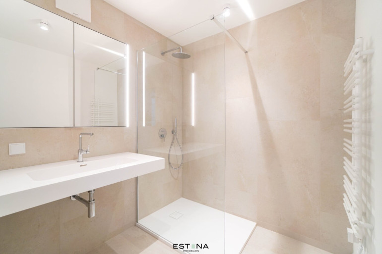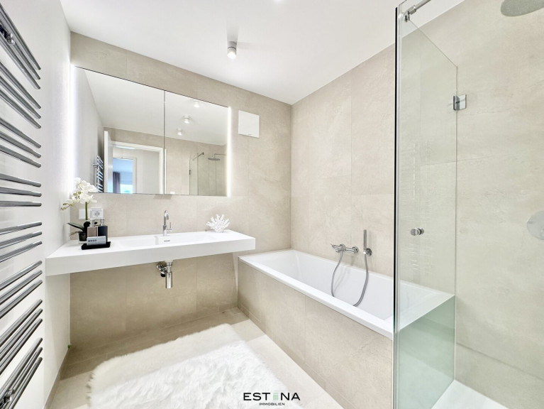 - 2 Badezimmer eins mit Badewanne, eins mit Walk-In Dusche und Doppelwaschbecken