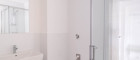 - Badezimmer mit Dusche, Waschbecken und Waschmaschinienanschluss