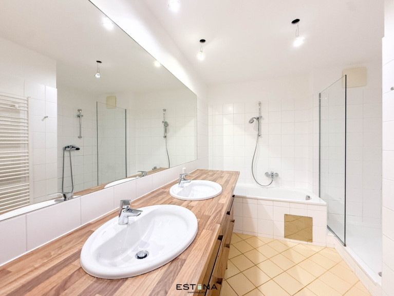 - Badezimmer mit Badewanne, Doppelwaschbecken und Waschmaschinenanschluss