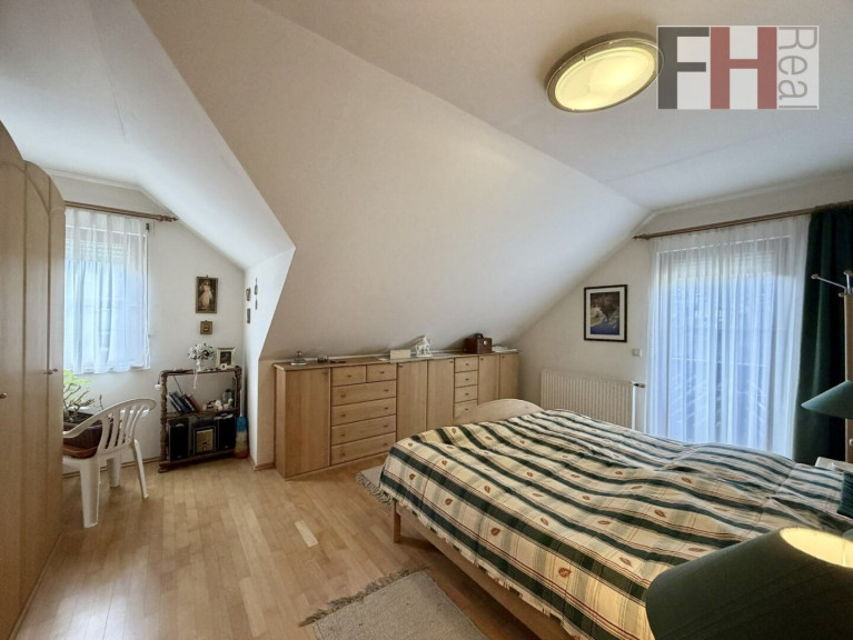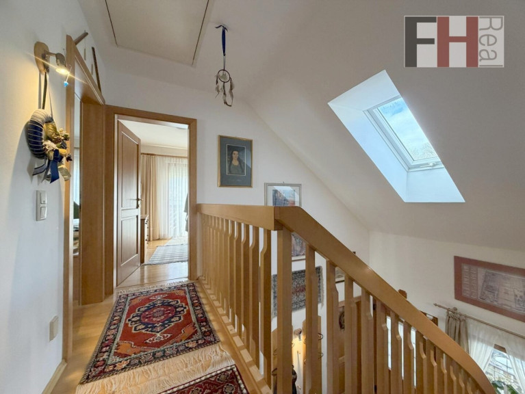 Über die schöne Holzstiege gelangen Sie in das Obergeschoss mit weiteren 3 Schlafzimmern, welche allesamt sehr vernünftig dimensioniert sind. Hervorzuheben ist natürlich der Masterbedroom mit knapp 20m² und Ausgang auf den Balkon mit toller Fernsicht, wobei auch ein weiteres Schlafzimmer diesen Vorteil genießt. Über das zentrale Vorzimmer haben alle Schlafzimmer Zugang zum großzügigen Bad mit Wanne und Dusche.