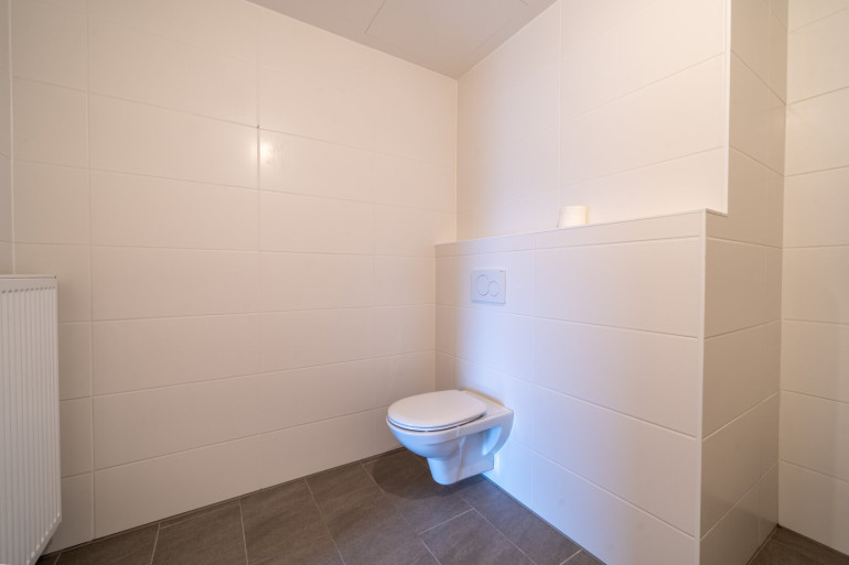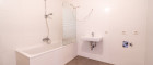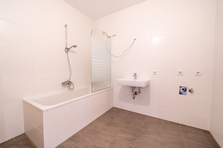 Das modern verflieste Badezimmer ist mit einer Badewanne ausgestattet. Ergänzt wird es durch ein Handwaschbecken, ein WC sowie einen praktischen Waschmaschinenanschluss.