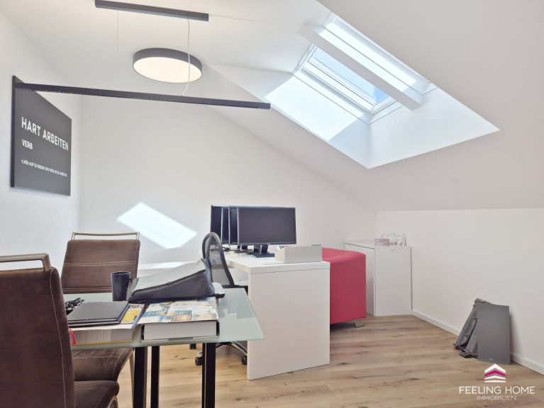 Das stilvolle Dachgeschoss besticht durch seine hochwertige Ausstattung. Große, 3-fach verglaste Velux-Dachfenster mit elektrischer Fernbedienung und Regensensor schaffen ein besonderes Wohlfühlambiente und sorgen das ganze Jahr über für angenehme Lichtverhältnisse.