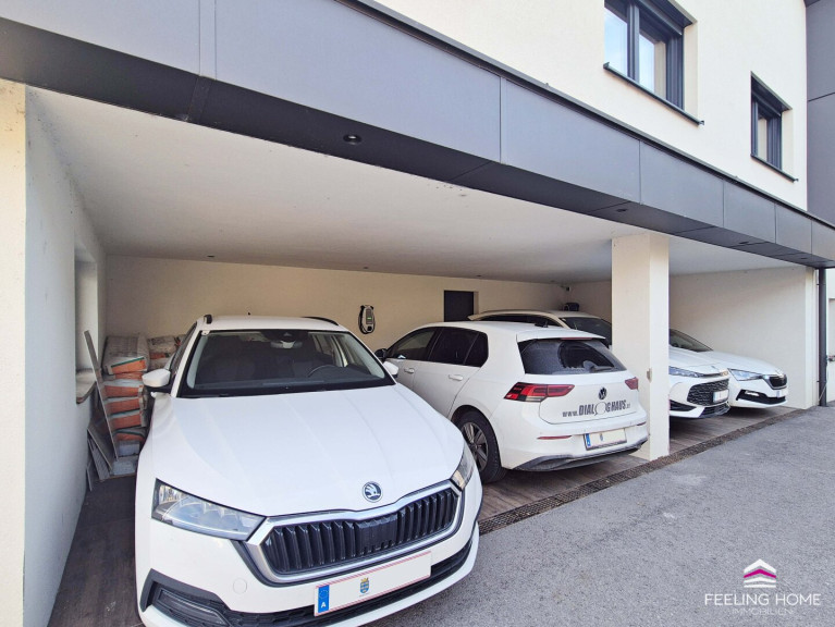Fliesen, Parkett, Fußbodenheizung, Einbauküche, Lastenaufzug, Westbalkon, Dusche, Carport, Parkplatz