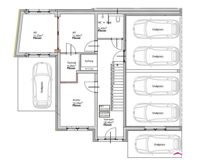 - 3 Stockwerke ohne Keller mit Lastenaufzug bis zur 1. OG (behindertengerecht)