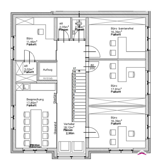 Die angenehme Raumhöhe und die energieeffiziente Fußbodenheizung sorgen für ein perfektes Arbeitsklima das ganze Jahr über. Der barrierefreie Zugang per Lastenaufzug macht dieses Geschoss besonders attraktiv.