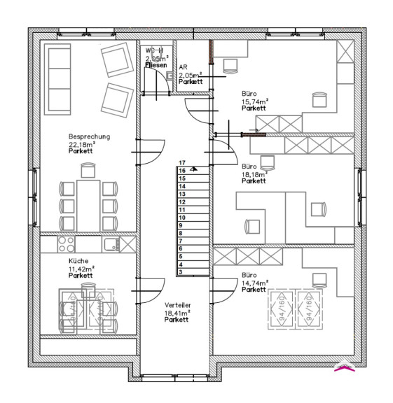 Gemeinsam mit dem ersten Obergeschoss bietet die Fläche großzügige 221,47 m² und damit vielfältige Nutzungsmöglichkeiten. Neben einer Küche, einem WC und mehreren flexibel gestaltbaren Büroräumen überzeugt das Dachgeschoss vor allem durch sein attraktives Potenzial zum Umbau in eine moderne Wohnung – ideal für alle, die Arbeiten und Wohnen elegant miteinander verbinden möchten.
