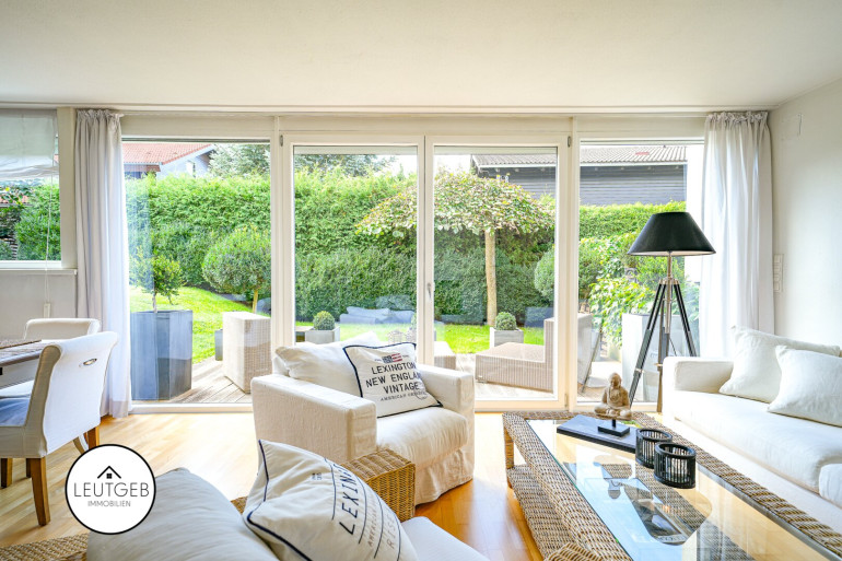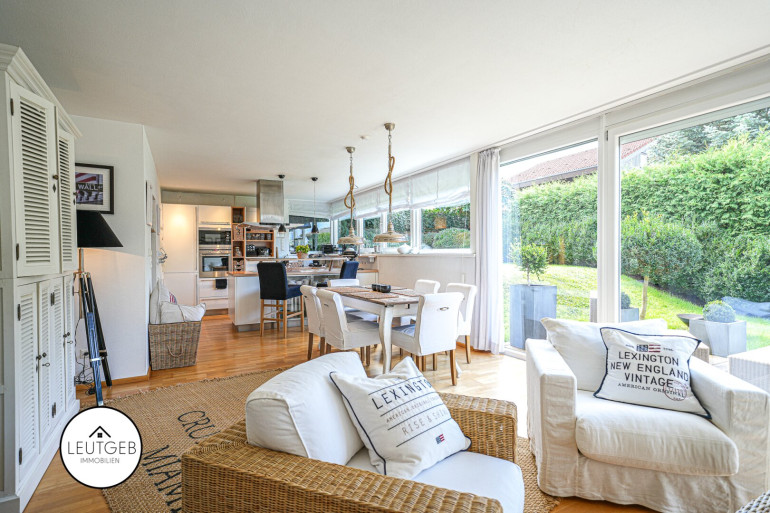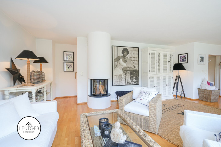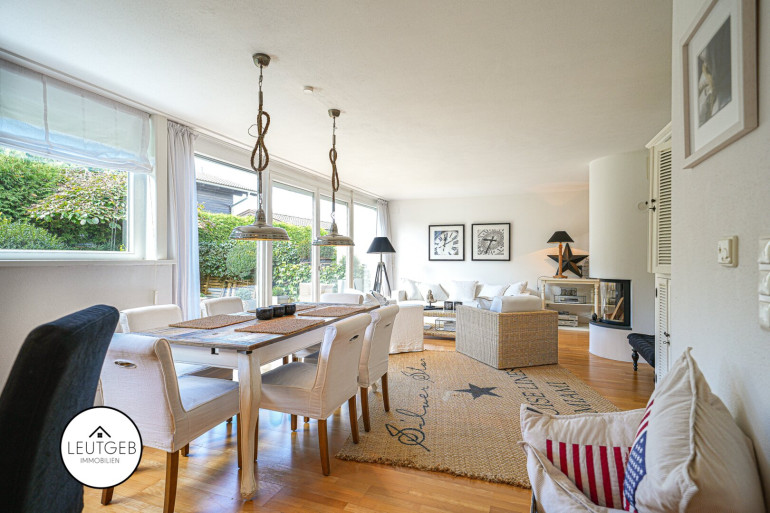 Vom Eingangsbereich aus gelangen Sie direkt in diesen lichtdurchfluteten Wohnraum, der durch große Fensterflächen ein angenehmes Raumgefühl schafft und einen nahtlosen Zugang zur sonnigen Terrasse und dem liebevoll angelegten Garten bietet – perfekt für entspannte Stunden im Freien oder gesellige Abende mit Familie und Freunden. Ein besonderes Highlight ist der im Wohnbereich integrierte Kamin, der an kühleren Tagen für eine behagliche Atmosphäre und zusätzliche Wärme sorgt.
