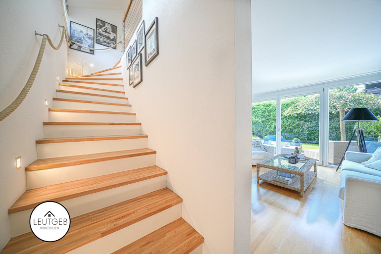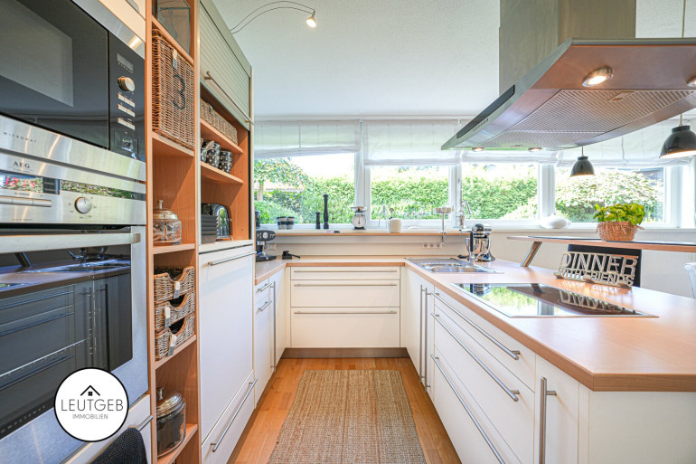 Die moderne Einbauküche mit hochwertigen Markenelektrogeräten fügt sich harmonisch in den offenen Wohn-Essbereich ein und bietet alles, was man für komfortables Kochen benötigt. Ergänzt wird die Küchenausstattung durch ein hochwertiges Abzugssystem, welches geruchsfreies Kochen auf höchstem Niveau ermöglicht. Ein separates Gäste-WC und ein funktionaler Abstellraum runden das Raumangebot auf dieser Etage sinnvoll ab.