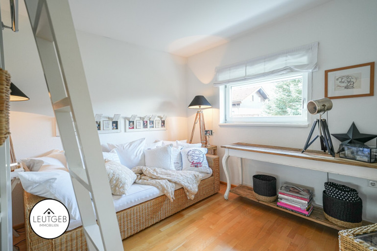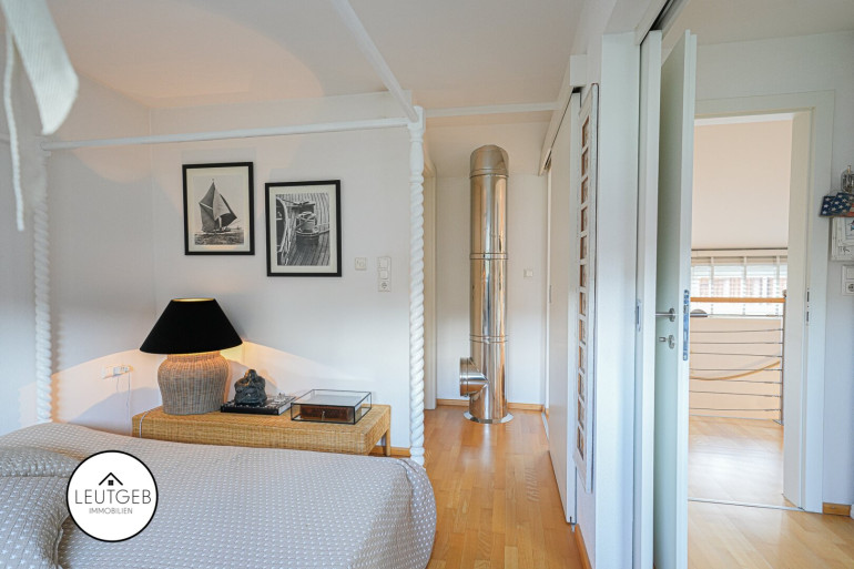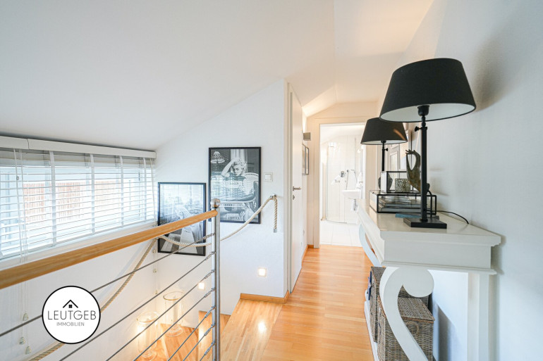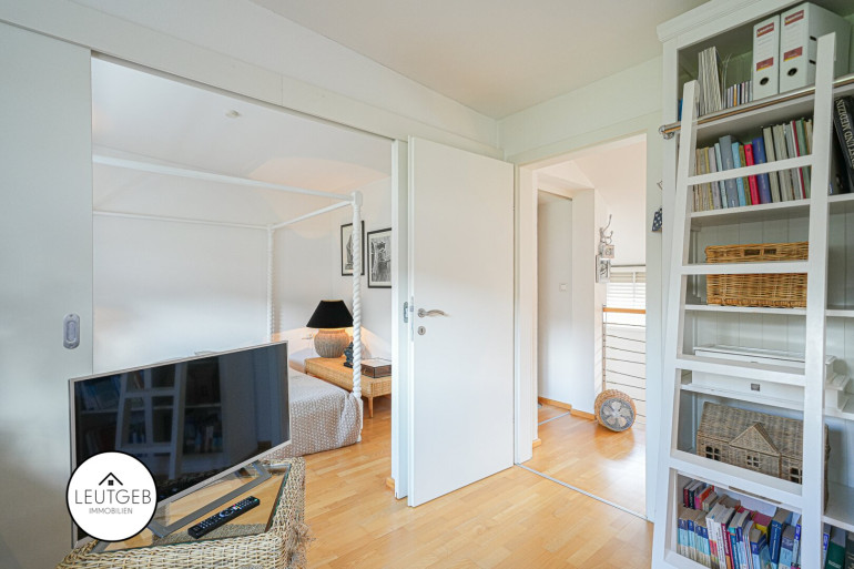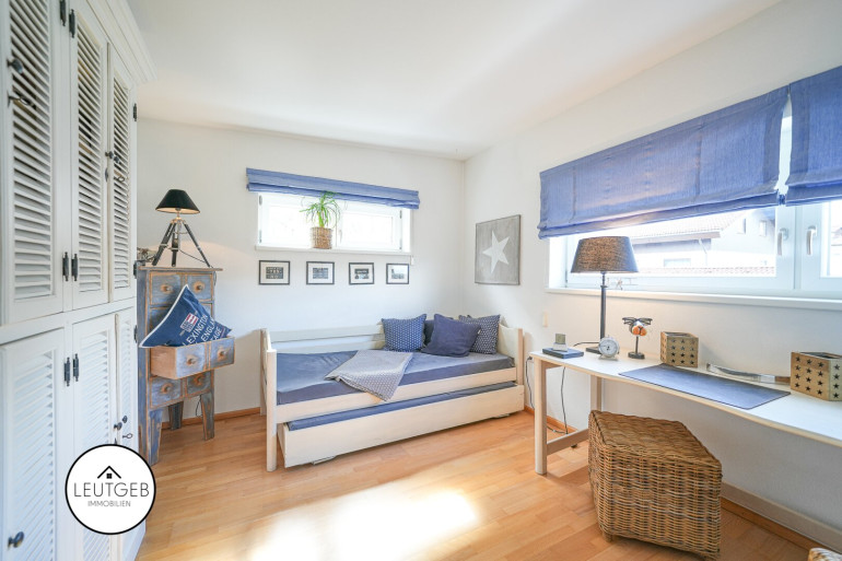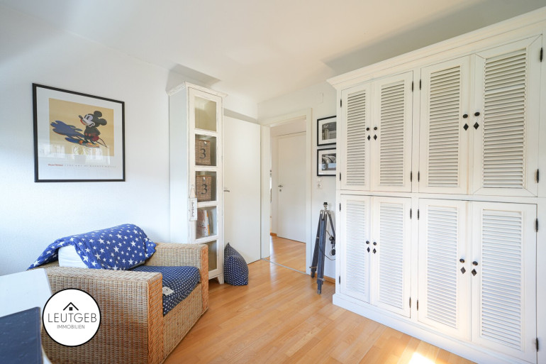 Über den Stiegenaufgang gelangt man in das Obergeschoss, wo sich die privaten Rückzugsräume des Hauses befinden. Auf dieser Etage stehen drei weitere Zimmer zur Verfügung, die flexibel als Schlaf-, Kinder-, Arbeits- oder Gästezimmer genutzt werden können. Alle Zimmer profitieren von einer großzügigen Belichtung und sind mit Rollläden ausgestattet.