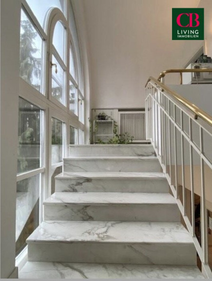 Im ersten Obergeschoss befinden sich weitere großzügige Räume mit eleganten Parkettböden. Küche, Nassräume und Stiegenhaus sind mit weißem Marmor ausgestattet.