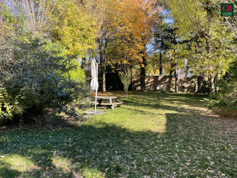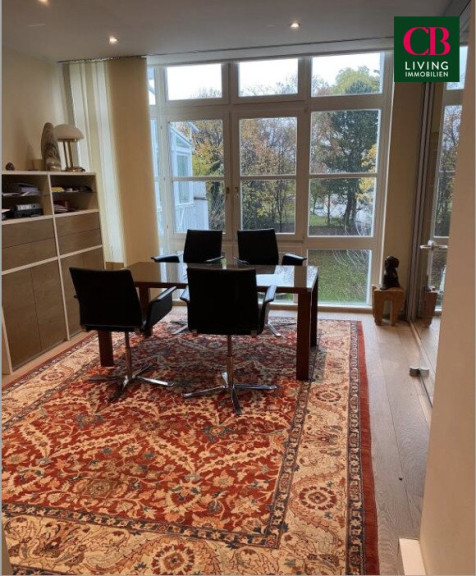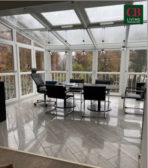 Ein besonderes Highlight bildet der vollverglaste Wintergarten, der derzeit als Konferenzraum genutzt wird und einen unvergleichlichen Blick in den liebevoll angelegten Garten bietet. Ergänzt wird dieser Bereich durch eine Küche, ein Badezimmer sowie ein separates WC.