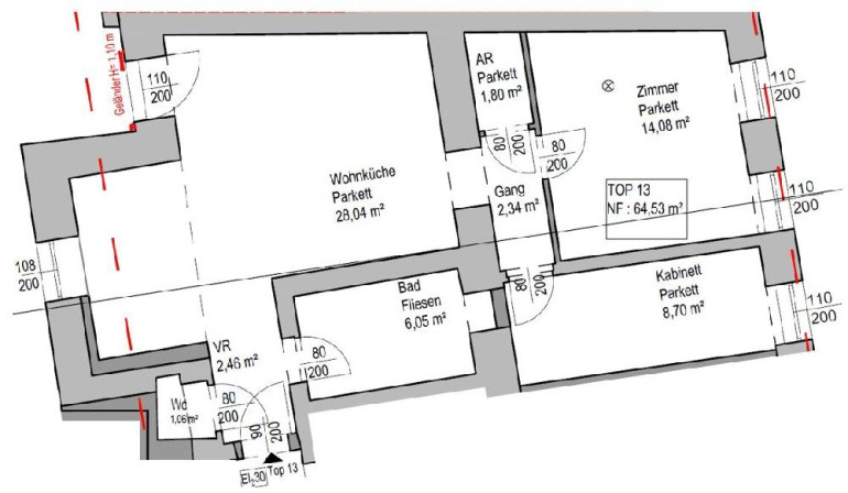 Die Wohnung Top 13 verfügt über 64,53 m² und teilt sich wie folgt auf: