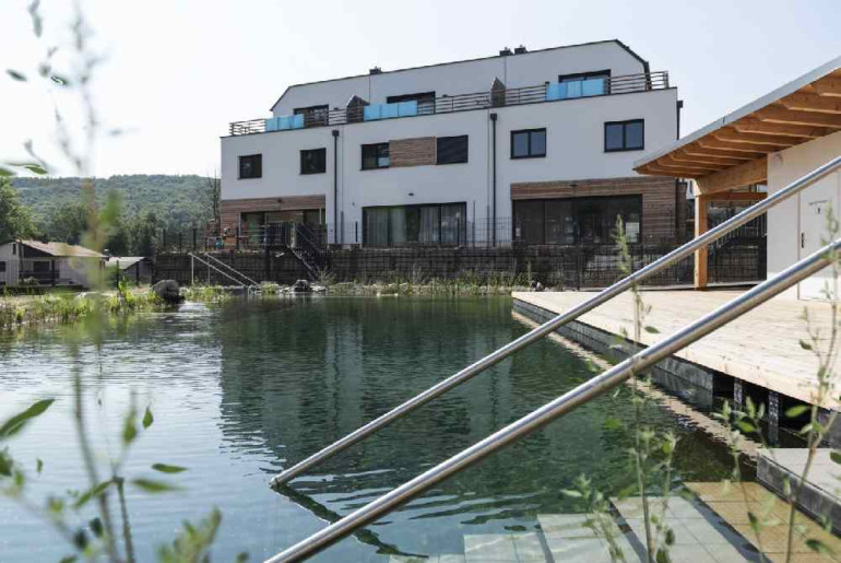 Um dieses Wohngefühl zu erzielen, war für uns besonders wichtig, dass sich die Architektur der einzelnen Häuser nahtlos in die Natur einfügt. Erreicht haben wir das unter anderem durch die teilweise Holzverkleidung der Gebäude und Begrünung der Dachflächen.