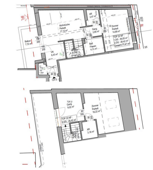 Die Wohnung Top 22 verfügt über 77,47 m² und teilt sich wie folgt auf: