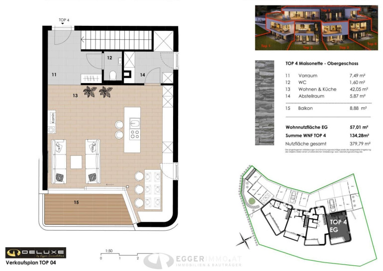 Die Wohnung ist als Maisonette über zwei Geschosse aufgeteilt: Im Erdgeschoss befinden sich die Schlafzimmer, im Obergeschoss der Wohnbereich mit fantastischem Ausblick. Großzügige Terrassen- bzw. Balkonflächen sind den Wohnräumen direkt vorgelagert und schaffen ein Wohngefühl mit Weite, Sonne und Panorama.
