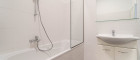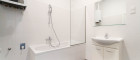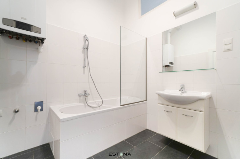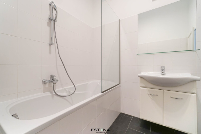 - Badezimmer mit Badewanne, Waschbecken und Waschmaschinenanschluss