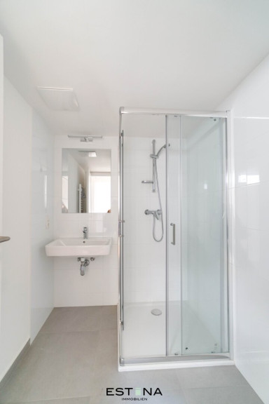 - Badezimmer mit Dusche, Waschbecken und Waschmaschinenanschluss