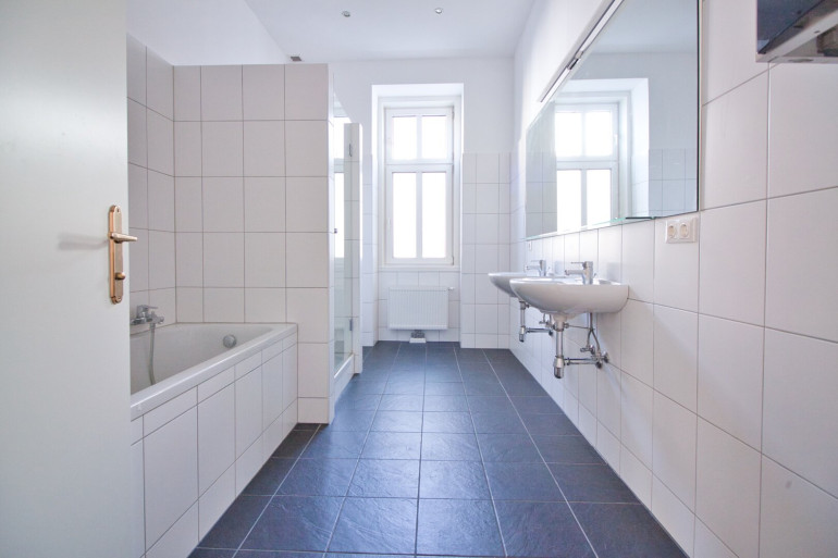 - Bad mit Badewanne, Dusche, 2 Waschtischen, WC & Fenster