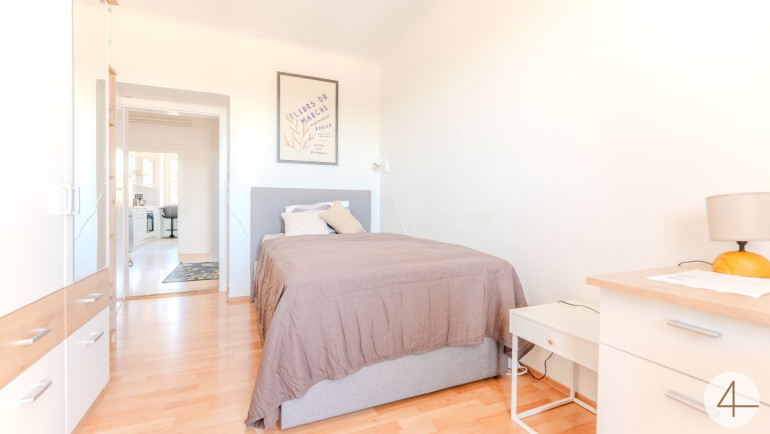 Raumaufteilung: 1 Zimmer mit Balkon, 1 Zimmer mit Schrankraum, 1 Zimmer, Küche, Bad mit Badewanne, WC, Vorzimme
